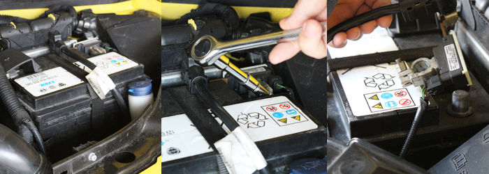 La prima operazione sarà quella di staccare il polo negativo, operiamo dunque con la chiave a bussola con cricchetto da 10mm. Svitando leggermente il bullone, il morsetto si allenterà dandoci la possibilità di staccarlo. Fatto questo, mettiamolo da parte e occupiamoci adesso della cinghia di blocco batteria (eventualmente, aiutatevi nel vedere meglio con una luce).